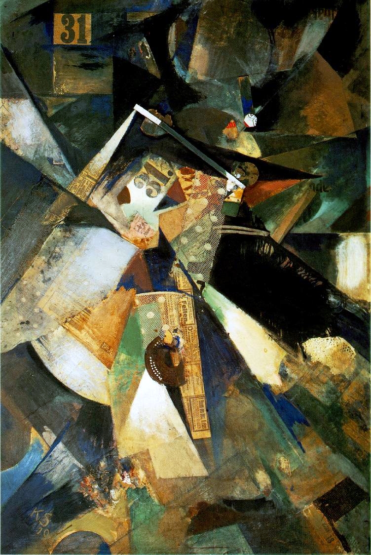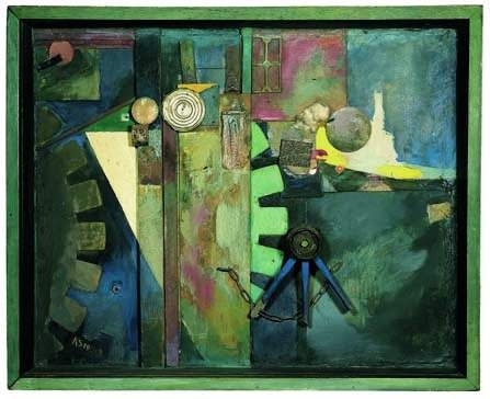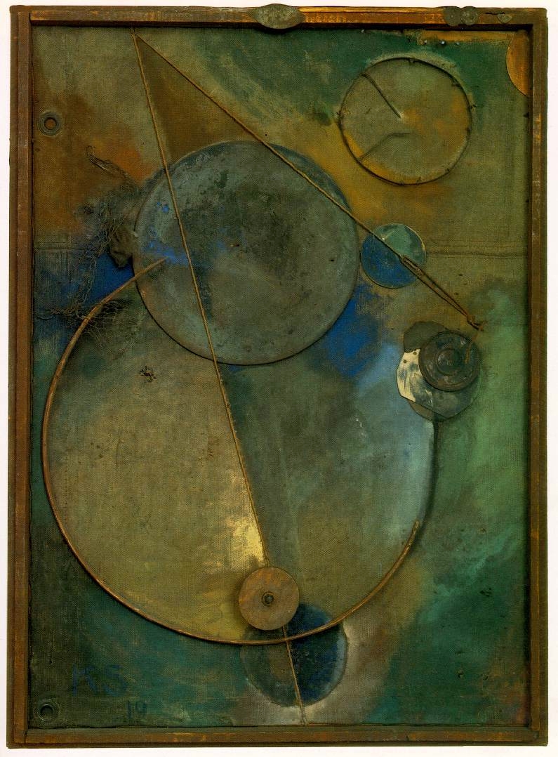 Steinberg's aesthetic is partially inspired by the freedom given to artists by the founders of dada. Especially, Kurt Schwitters, who ran with Duchamp's assertion that art can be made from any material an artist sees fit. Schwitters became infamous for incorporating all kinds of salvaged (sometimes prankishly stolen) detritus of modern culture into his collages and assemblages. Some of Kurt Schwitter's paintings from 1919-1920 like Merzbild 29A (Picture with Flywheel,) Star Picture, and Circling would look quite at home among the stacks of four decades of assemblages in the Steinberg home and studio. There is a similarity of merz materials, color and abstract composition, but Steinberg has added the writhing and dancing textures that are physically delightful and far too retinal to be considered a direct descendent of the dada school. For, each of Steinberg's assemblages is a visual record of a wrestling match between the wild horses of disparate and unruly materials and the artist's playful efforts to tame, reign and weave them into a disciplined and polished work that expresses the artist's triumphant mastery and joy of process. Above this exuberant baseline, canters the emotional collage that gives each piece it's distinctive rhythm and mood.