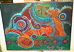 RS: "This over here is a whole new shebang. I've got overlapping curtain material in order to make this background on this piece. It gives you a very interesting effect on the artwork."