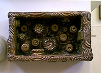 RS: "These are pistachio nuts on this assemblage here. Of course the weaving. This next one is called " Chuck's Keys". "Chuck's Keys. " Chuck was a very good friend. He was a teacher at one time. These are from the Chicago Board of Education they are stamps and this was a little pouch we found in his house. We cleaned it out. It was about six months of work cleaning out his art garbage. This is from when he was in the Marines. Those are his keys and of course he was Jewish. I put in a little star. Chuck knew about Indian lore. This is sort of a take off on Indian copper. From northwest coast Indian. There are things in that pouch, I took some of his stuff and put it in there."