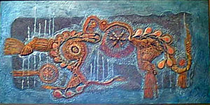 Steinberg values and is inspired by the primitive as much as Paul Klee. Unlike Klee, Steinberg is not searching for the quintessential primitive symbol. He utilizes primitive material and composition then refines and enriches it with design like wetting a stone to enhance its luster.