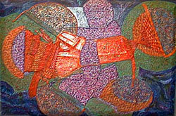 The following interview took place in the artist's home and studio. The purpose of my visit was to talk to him about his career and his participation in two shows at The Chicago Athenaeum. I was there to offer assistance about which of his newest pieces he should exhibit. My visit and the interview began with a tour of his extensive art collection of his fellow Chicago artists. Many of the artists he points out are or were members of the Chicago Society of Artists, the oldest continuous artist collective in the United States. (Rubin Steinberg is one of the exhibiting artists for the Chicago Society of Artists Exhibit at The Chicago Athenaeum March 16 through May 6, 2002.) He is articulate and very easy to interview. Mr. Steinberg was an elementary and high school art teacher for 38 years and is very informative and forthcoming about imparting information about his career and artwork. There are only a few times in the course of the tour through his home and studio where I needed interject with a question.