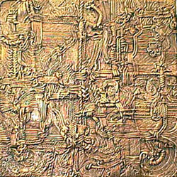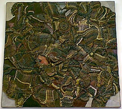 Rubin Steinberg is an artist who is best known for his assemblage bas-reliefs. The bas-reliefs are characterized by a heavily textured appearance that is actually varying types and gauges of woven rope and chord. From piece to piece the resulting impressions are very different. The weaving is often topographical with undulating peaks, valleys, and plains. Sometimes it is reminiscent of the knitting of muscle fiber or neurons. Other works have the industrial look of masses of electrical wires and circuit boards. Several pieces seem to be influenced by ethnic art. The assemblages are usually built up on a wood panel, where the painted fiber work evokes thoughts of a painting seen under a magnifying lens on a very inconsistent and loosely woven canvas. It's as if the irregular warp and weft of a canvas was being enlarged and then enlisted to serve in place of brush strokes. In addition to the woven elements of the bas-reliefs he tends to utilize leather, gears, brass repousse, cork, found woven materials (especially his mother's crochet work), and any other bits and pieces that strike his imagination.