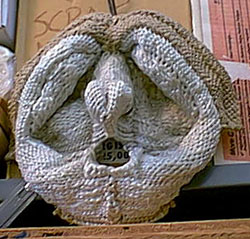 RS: "Right. I use a lot of found fiber. This was my first real collage right there. You know, I work on little things like these I get to a point and then I say, Oh the Hell with it!. It was going to be a mask and then it was going to be a figurine. Then I just thought that's good enough."