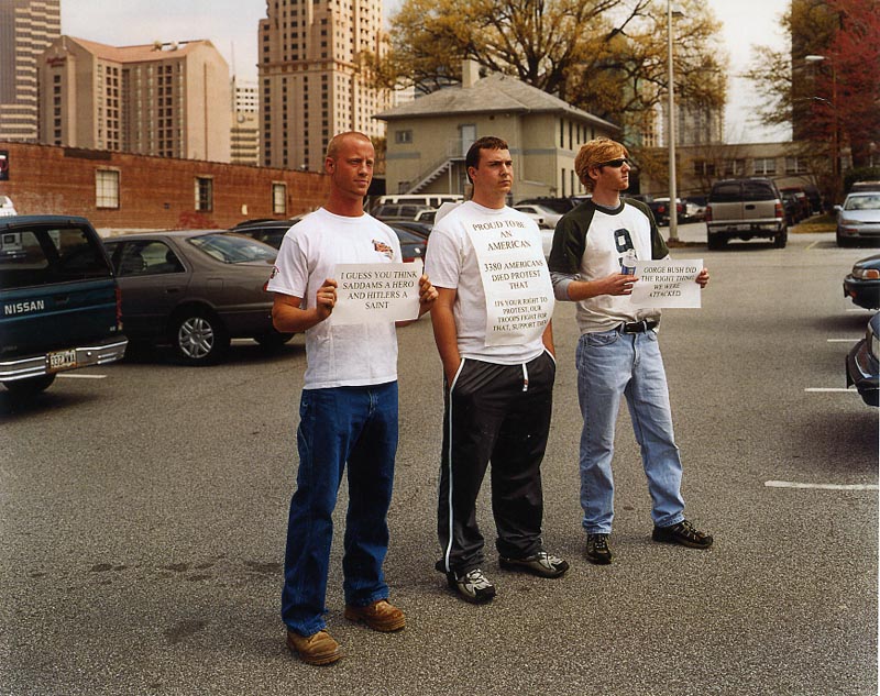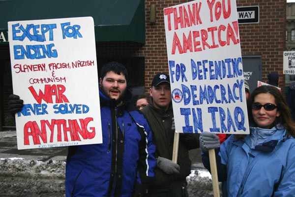 Counterprotestors (n.d.) Tim DavisB: Similar images, different contexts. On the RPI College Republican website, the protest image reads as supporting Bush war policies. Situated within Davis's book, his image encourages a negative reading of such protestors (witness his biting commentary on this image in the back of the book).