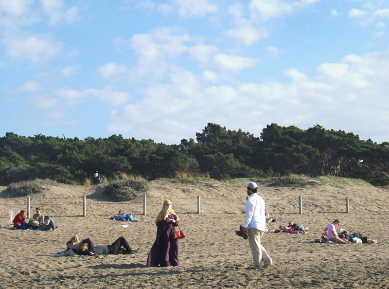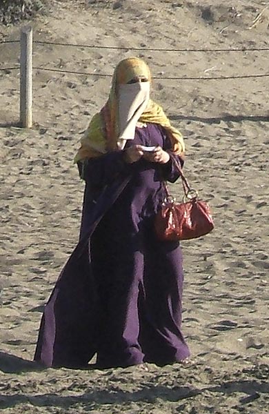 A: If a threat, nobody seems concerned here. I read her placement there as more hopeful, reconciliatory. Like The Blessed Virgin appearing to peasants. By the way, I just flashed on how similar this image is to the many photographs we've seen in our photographic careers (some by Robert Frank) but with a difference: now an Islamic-looking woman, the signifier of Otherness in our Terroristic Times, appears like an uncanny apparition on our shores.