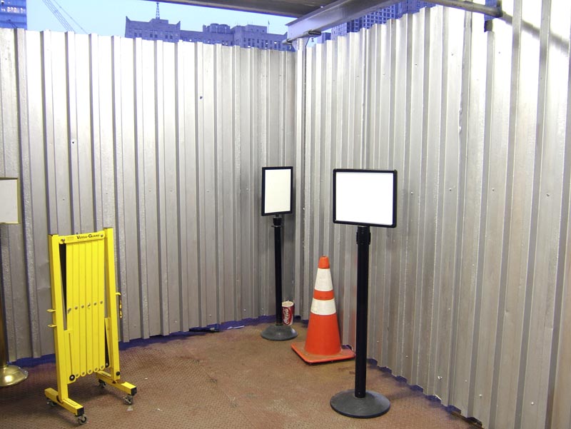 B: Yes, both images present a visual enigma, one literally constructed, one found and enhanced-in-frame by Koch's keen eye. Just look at that image of Koch's! What the hell is going on? Blank signs, a yellow folding barrier, a metallic wall, a red cone that might be worn by a dunce. Some event is obscurely revealed recalling how cloaked in mystery, obfuscated, are the Bush Administration's behind-the-scene machinations.