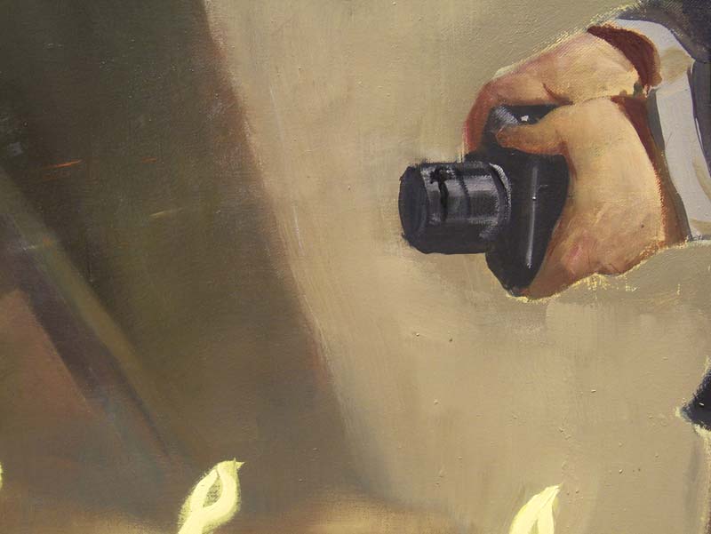 A: Ahhhh. But this could also be a reference to the warrior then and now in Iraq, the persistence of conflict in that area of the world. Now notice that the print of the detail of the Neo Rauch painting, the hand holding a camera, is placed near that shot made at the Denver Airport, so that the two images are made to resonate with issues of our panoptic society's will-to-surveille.