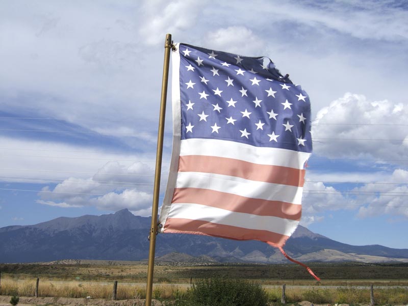 B: One of Lyons' prints, in black and white, seems patriotic compared to both Frank's treatment of it in the photobook, The Americans (1959), and to Koch's remarkable color shot of a flag torn perfectly in half.