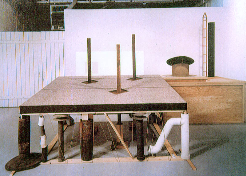 A: And that's why the show sustains our interest, I think. Nothing simple gels and thereafter remains understood. It's an open text that deconstructs "unhealthy" signs, only to reconstruct them as demythologized signs, "healthy" signs in Roland Barthes' sense of the concept. Each totem has a "head," a "body" of some vertical element, and a "foot." Rather than read the images as a sequence in time as a horizontal arrangement would suggest, the viewer initially perceives a gestalt, a figure. Then he or she starts to break down the totem into individual images, then strives to reconnect them again creating other possible meanings. Synthesis, analysis, new synthesis.