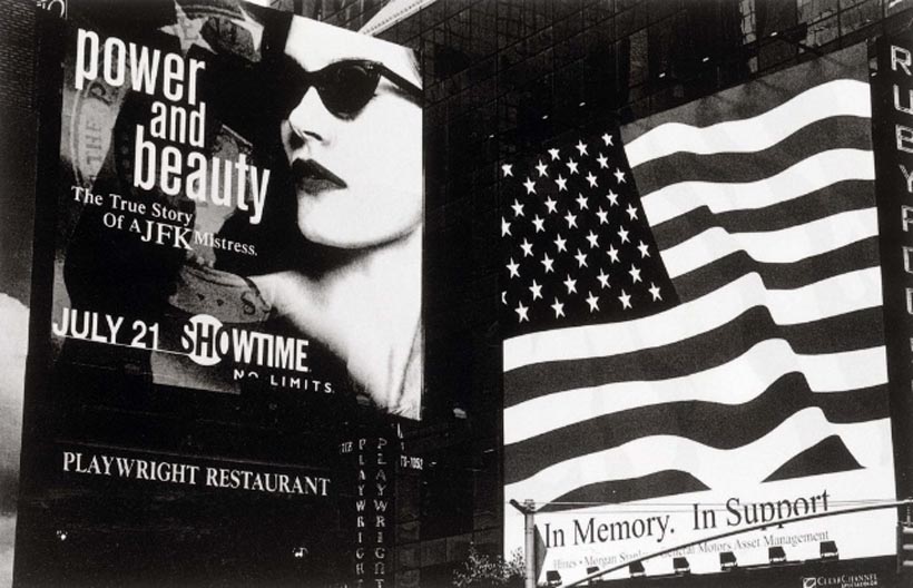 B: Surprising that Koch's rendition of our flag, luscious with color that one would expect to result in a more patriotic image, wholly subverts its positive qualities, and Lyons's monochromatic treatment, what has usually resulted in a more critical comment on patriotism, is celebratory. Another photo from Lyons's series is more ambiguous though, more akin to Frank's take on the American scene, what with the flag's juxtaposition to an ad for a Showtime special, "Power and Beauty," exploiting JFK's womanizing. Two aspects of our society are put into provocative tension here.